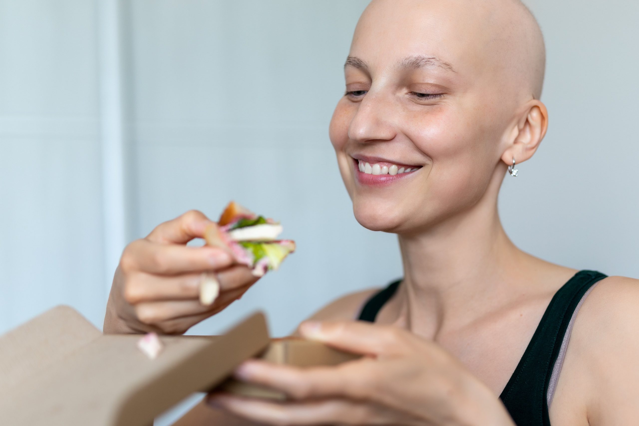 woman with bald head due to cancer smiling and eating a sandwich